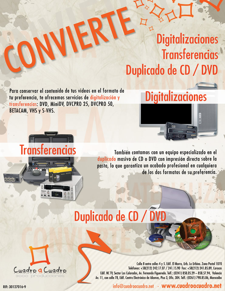 Para conservar el contenido de tus videos en el formato de tu preferencia, te ofrecemos servicios de digitalización y transferencias: DVD, MiniDV, DVCPRO 25, DVCPRO 50, BETACAM, VHS y S-VHS.